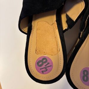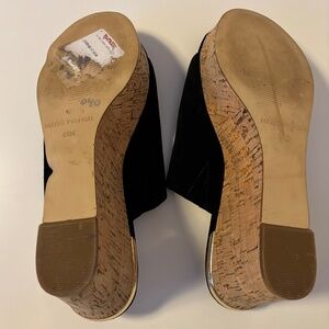 Marc Fisher Suede Leather Chunky Cork Platform Wedge Heel Sandals in Black and Tan and Womens US Shoe Size 8.5. Gently used and in good condition with some minor wear (see last picture).