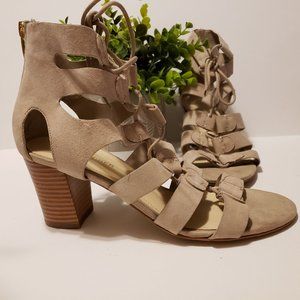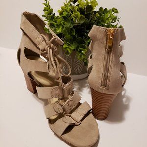 Stylish tan ankle booties. Lace-up design. Perfect for any occasion.
