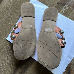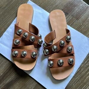 Chic tan sandals featuring striking metallic accents. Ideal for everyday style.
