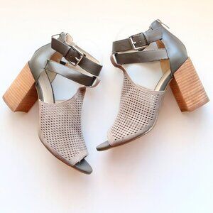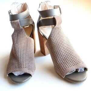 Marc Fisher Taupe Laser-cut Suede Leather Peep Toe Block Heel Ankle Strap Sandal