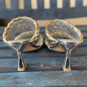 metallic sandals, braided heels, Marc Fisher shoes, square toe shoes, kitten heel sandals, silver gold sandals, two strap sandals, braided design shoes, low heel shoes, women's heeled sandals, metallic braided sandals, designer sandals women, Marc Fisher metallic sandals
