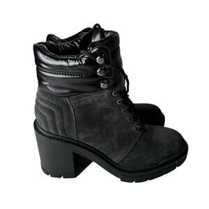 Marc Fisher LTD Velima Lace-Up Booties in Black. Size 6.5. Features round toe, block heels, suede upper, mixed-media design, platform lug sole, and lace-up closure. Excellent pre-owned condition.