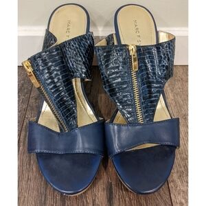Very good pre-owned condition. Marc Fisher Winner blue faux crodile platform wedge sandals with cork base. 4 inch heel. Size 9