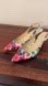 Floral pattern with pointed toe. Slingback design for a chic look. Ideal for adding flair to any outfit. See pics and video for small scratches on heels.