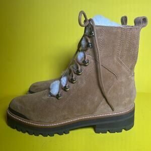 Marc Fisher Izzie Lugsole Suede Leather Ankle Boot Size size 7.5. In excellent used condition. Winter boots with real sheep fur Approximate 1- 1 1/4 inch heel. Non slip sole.