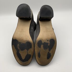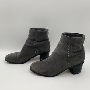 Marc Fisher Women's Gray Suede Ankle Booties in Size 7.5M. Style name is Umala-T. Round toe and 2.5" block heel. Small silver studs adorn the heel, and go around the front and sides of the booties. These have a zip closure at the back of the heel. These booties measure about 4.75" from the top of the back heel to the top of the bootie that reaches the ankles. When zipped up, the ankle opening measures about 9" around. Some wear to bottoms and tips of the sole and to the back of the heels. There is also some wear on the insoles by the heel area. In overall good pre-owned condition. The suede uppers are in very good condition.