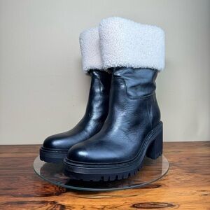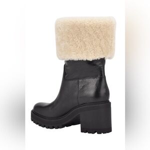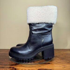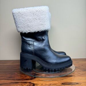 A plush cuff of genuine shearling warms a gorgeous, winter-ready leather boot lofted by a block heel and finished with a lugged, traction-enhancing sole.