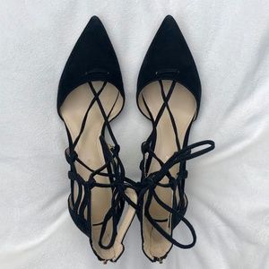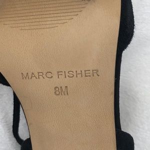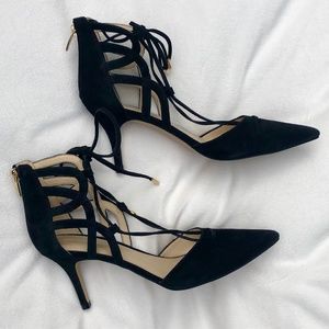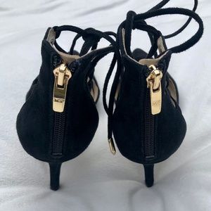 Marc Fisher black suede heels in size 8, true to size. Features lace-like cut out detail, back god zip and tipped suede laces tie around ankle. No flaws. Bought new, wore 1x. From a smoke and pet free home.