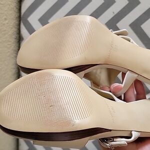 4 inch heels. Cream colored, have buckle closure around the ankle. Has a couple of little marks, see close ups. Otherwise still some really nice shoes. Wedding, occasion, dinner, quiet luxury, feminine