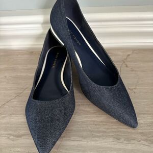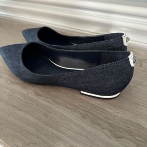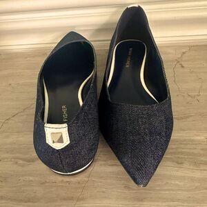 Step out in style with these chic, blue flats from Marc Fisher. Perfect for any occasion, these shoes offer both comfort and elegance. Trimmed in white leather and silver heel stud.