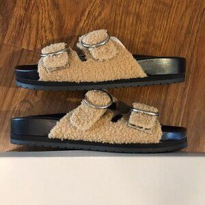 Brand new in box size 8 faux shearling slides sandals with silver buckle hardware by Marc Fisher