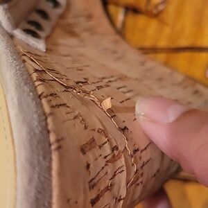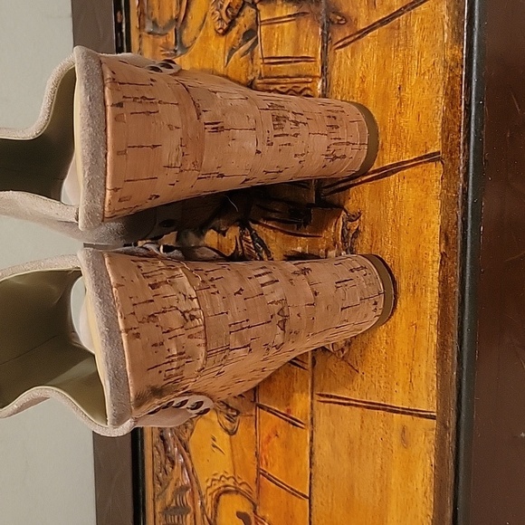 Marc Fisher suede platform wedge sandals. Nailhead trim. 5-inch platform. Neutral sand color. Shows some wear, pls look at all pics.