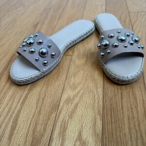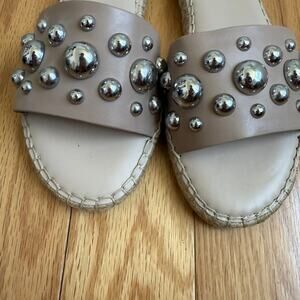These are new Marc Fisher slide sandals, size 9M. The sandals feature a beige leather-like upper adorned with silver-tone spherical studs. The footbed is a light beige color, and the sole is a dark brown rubber material. The edges of the sandals are trimmed with a woven jute-like material.