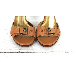 Marc Fisher tan brown leather high heel buckle open toe ankle strap sandals 6.5 M