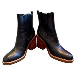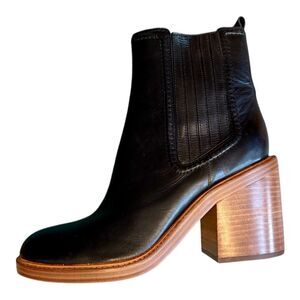 Brand new, never worn Marc Fisher ankle boots crafted from smooth black leather with a chic almond toe and stacked wooden block heel. Featuring classic Chelsea styling with ribbed elastic side panels for easy pull-on wear. Sleek, timeless, and perfect for elevating everyday outfits or dressing up for a night out.