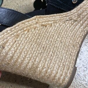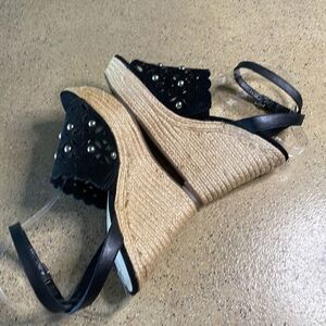 Marc Fisher "Hata" Espadrille Wedge Studded Sandals. Features genuine black suede uppers with pretty laser cut out design and silver ball studs (all studs are intact), adjustable ankle strap, nicely padded footbed, jute wrapped wedges and platform. Worn once with some light wear to footbed liners and bottoms but no flaws to note. There is some glue/exposed ends of the jute wrapping on the wedges, but this is normal for jute material and not a flaw (see last pic). See pics for measurements. These are great with shorts, sundresses and even wide leg pants as we move into fall!