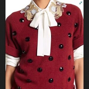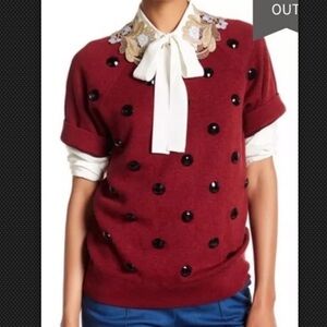 Glossy, faceted buttons march in regimented rows across the front of a finely knit sweater styled with short raglan sleeves for a look that's subtly sporty.