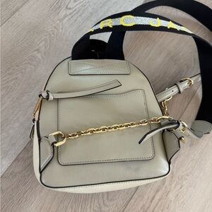 Chic Marc Jacobs backpack in cream. Features bold gold hardware. Stylish strap with logo detail.