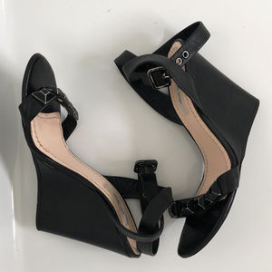 Black leather Marc Jacobs wedges with silver-tone hardware, stud embellishments at uppers, tonal stitching, covered heels and buckle closures at ankles.