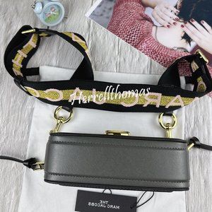 Elegant black bag with gold hardware. Features pink and gold branded strap. Ideal for versatile styling.