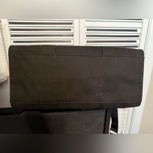 Stylish black tote bag with bold white lettering. Features dual handles and a detachable strap. Perfect for everyday use. Bottom had a mark I got off but it left a bit of paper towel residue on the canvas.