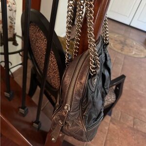 Stylish Marc Jacobs shoulder bag in black and gray leather. Mixed Quilt style. Features chain straps and elegant design. Mini pushlock detail. This is a fabulous bag. One of my all time favorites. Super easy to wear and not too heavy. Love it!