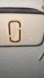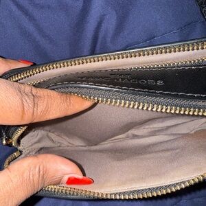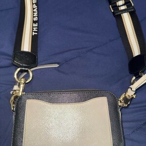 Elegant black leather cross body bag by Marc Jacobs. Features navy interior and zip closure.