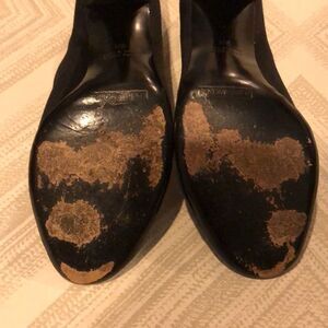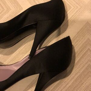 Adorable heels peep toe/open toe. Bow in front is missing a few stones in each bow. Notice a few loose threads in heel. Only very visible when zoomed in. Heel measures approx 3.5”. No dust bag or box. VD.