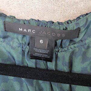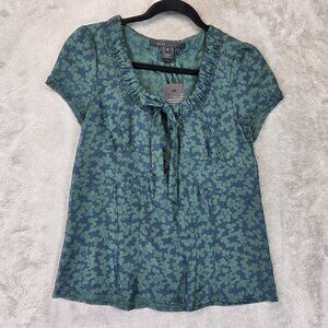 Marc Jacobs Blouse Womens 6 Blue Green Silk Ruffle Neck Short Sleeve Floral Top