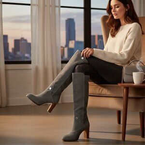 An iconic Y2K silhouette from Marc by Marc Jacobs, these grey suede knee-high Runway boots are a rare vintage find in excellent pre-owned condition. Featuring a sculpted semi-pointed toe, curved block heel, subtle side platform, and silver hardware accent at the collar and ankle, they strike the perfect balance between structured and soft. Fully suede-covered with rich texture and little signs of wear—uppers, soles, and interior are excellent. This exact runway style is nearly impossible to find now, especially in this lovely rich grey.