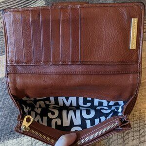 This is a Marc by Marc Jacobs wallet in brown with gold colored hardware. It is in good pre-owned condition with minor wear on the edges. The dimensions are about 7” x 4” x 1”, and the last two images show measurements. Soft 100% cow leather with cotton logo lining. Turn-lock flap closure, interior zip pocket, card slots.