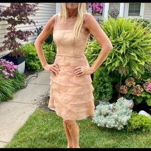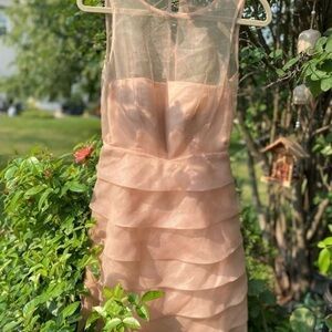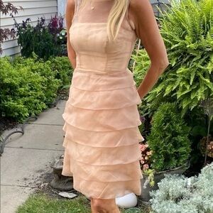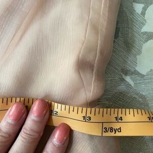 Slight shimmer. Lining is cream. 3 ties on the back. Zipper and hook back closure.