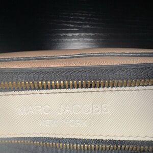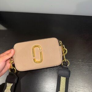 Elegant Marc Jacobs crossbody with cream body and gold accents. Features bold strap design. Ideal for everyday use.