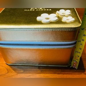 Authentic Marc Jacobs Daisy Perfume brand cosmetic bag / travel make-up bag in about 18x18x10 cm large and deep cubic shaped hard box, zipped all around. It is covered with shiny gold faux leather like material over both outet surfaces and all white inside. Beautiful white Daisy flowers attached to the top cover. Marc Jacobs Daisy logo is also embossed on top cover. Please see all pictures with exact measurements. It has quite ample storage for your make-up and cosmetic items. New, never used.