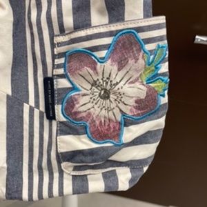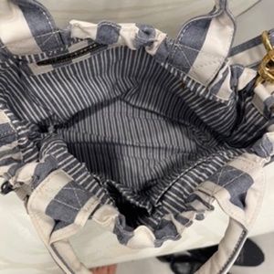 Perfect for the summer white and blue drawstring tote! Cute flower appliqué with tons of pockets!! Good pre-loved condition (some white has yellowed a bit!)