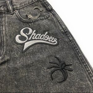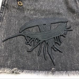 Marc Jacobs embellished mini skirt with patch appliqués, pavé dangling charms-and safety pin. Five-pockets and button and zip fly styling. Leather-embossed logo patch. This is a rare design - retail $690.