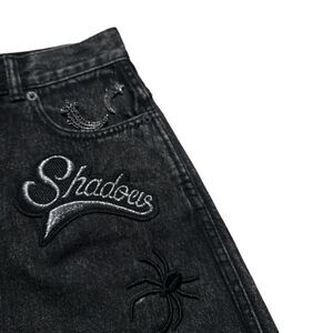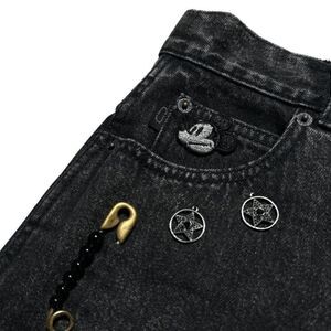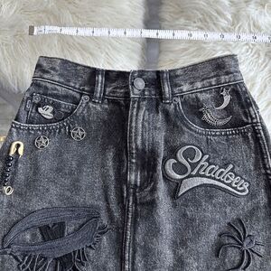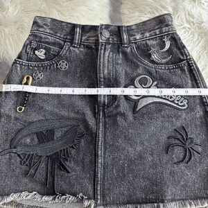 Black Marc Jacobs embroidered denim skirt with five pockets and embellishments featuring zip closure at front. Size not listed, estimated from measurements.