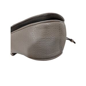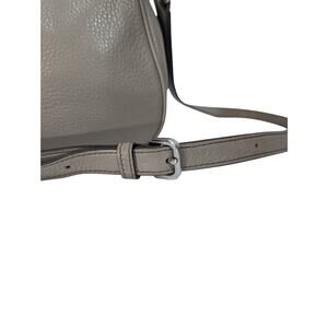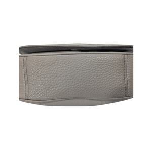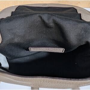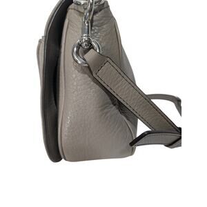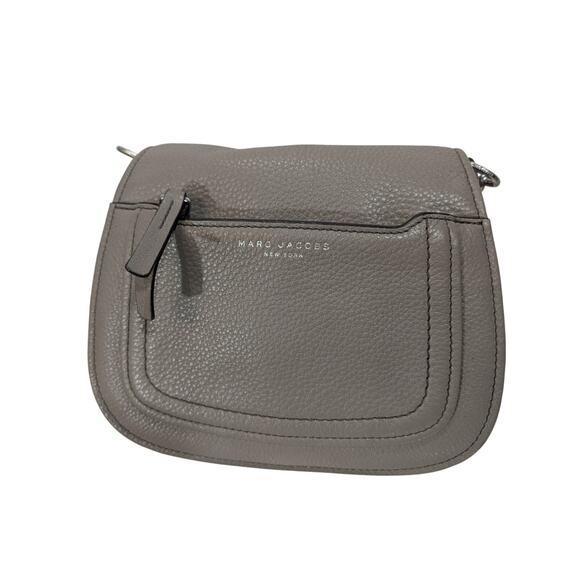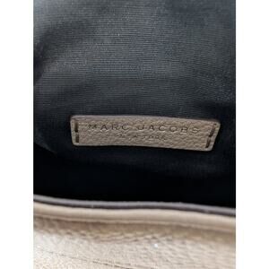 Marc Jacobs Empire City crossbody bag in taupe pebbled leather with a light shimmer and silver toned hardware. Magnetic flap closure with large front zip pocket. Black fabric interior with two slip pockets. Adjustable strap.