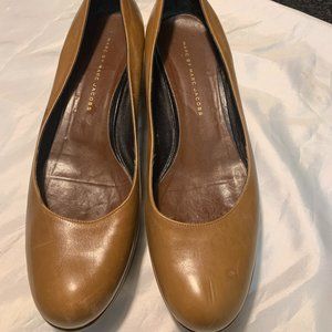 Worn brown leather flatform heels with 2-inch platform at the heel. Some scuff marks and scratches.