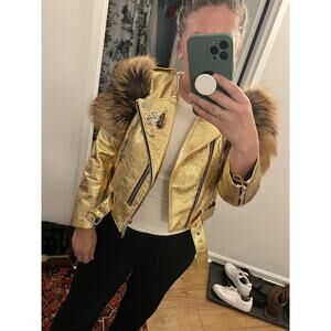Marc Jacobs Fox Fur Leather Jacket Gold Sequin Lips Lil Kim Medium 6.