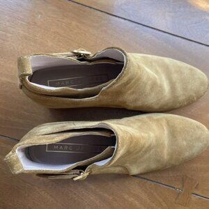 Beautiful pair of Marc Jacobs women's ginger suede interlocking ankle boots. Camel colored genuine suede upper, low heel with genuine cru stack, gold buckle and ankle strap. Used condition, please see all photos. Size 36.