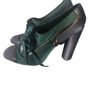 Marc Jacobs shoes, green heels, satin heels, lace-up heels, block heel shoes, EU40 shoes, designer heels, black accents, women's heels, elegant shoes, formal footwear, satin block heels, lace-up design