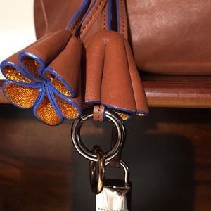 ๐๐SOLD ๐๐Marc Jacobs (not Marc by Marc Jacobs). Ruffled flap covers outside zip pocket. Zipper pull has three tassels and gold and silver ring details so bag jingles. Leather pull, padlock. Blue leather trim. Navy fabric, two sections and zip pocket inside. Straps are woven thread (not leather) metallic: gold, black, red. Removable leather wrap holds straps together. Excellent condition. Some black marks on bottom and back. Approx 16x11x5.5, 7 in drop.