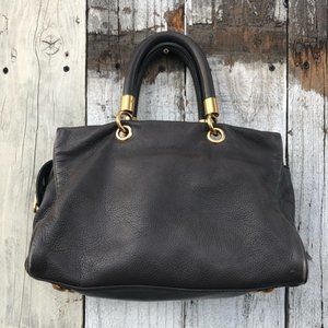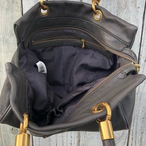 A streamlined, sophisticated satchel shaped from lush pebbled leather features an embossed logo plate and brushed goldtone hardware for added street-savvy style