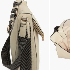 Bought from Nordstrom Rack, barely used it. “Marshmallow” color soft pebbled leather. Gray and black herringbone strap.