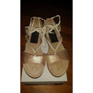 These women's Marc Jacobs Standard Supply shoes feature a chic lace-up, gladiator-inspired design with natural cotton laces tipped in silver metallic. The suede-lined insole offers comfort, while the 1 1/8" platform adds subtle height. With an open-toe, strappy style in a striking bronze color, these size 8 shoes are brand new in the box and originally retailed for $195.