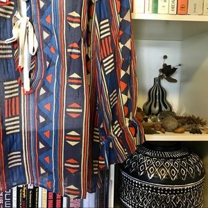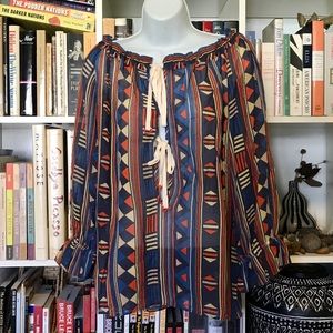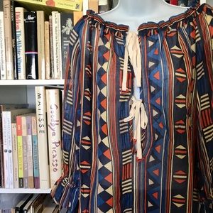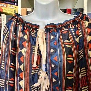 Flowy, printed blouse by Marc Jacobs. Size 2 but meant to run larger for breezier look. With the sexy lace-up detailing (that can be loosened for an off-shoulder look) and sheer fabric, this is the perfect top to wear over your bikini, or other light summer-wear!