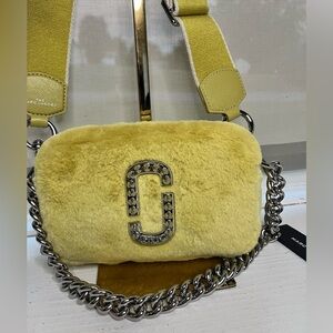 A luxe version of an instantly recognizable crossbody. This conveniently sized Marc Jacobs Snapshot camera bag features fuzzy faux fur, studded metal plaque logo hardware, and a sleek chain strap as well as a more modern canvas style, adjustable thick shoulder strap for a sportier look.