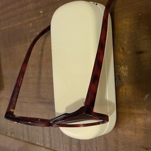 Flirty and fun red tortoise frames with mirrored lenses. Love the round shape with the cat eye edge. The measurements are in the photo above. Glasses are in good condition. Two small scratches as pictured, both out of line of sight.