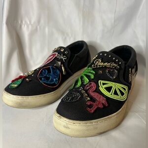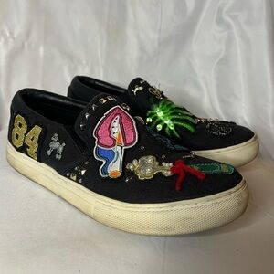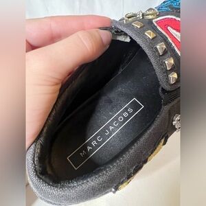 Marc Jacobs Mercer Slip On In Negro Black. Slip on style flat shoes. Embellished with patches, embroidery, sequins, rhinestones, etc. Moderate signs of wear - mainly just the white rubber sole. Still in really great condition. All embellishments are excellent condition. Size 39 (fits an 8 - 8 1/2).
